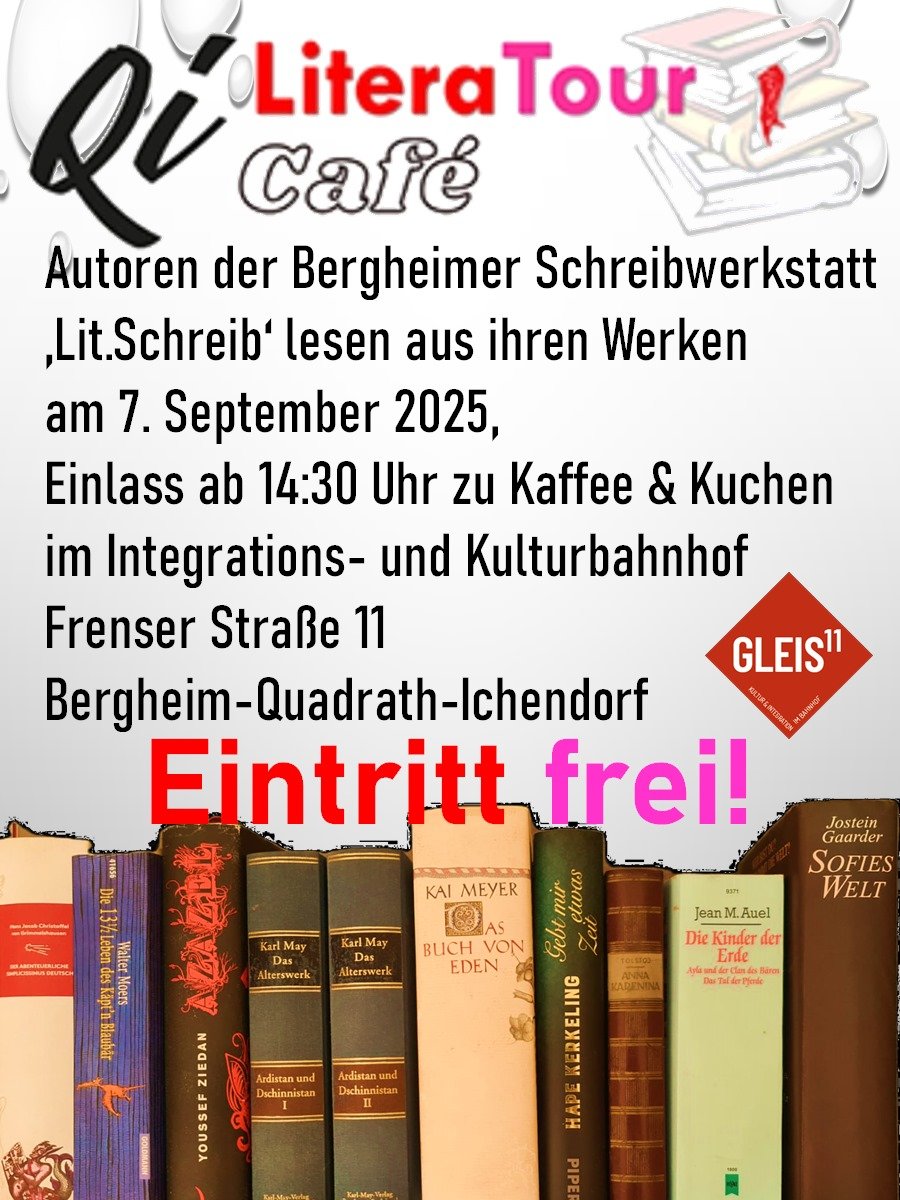 Autoren der Bergheimer Schreibwerkstatt „Lit.Schreib“ lesen aus ihren Werken am 7. September 2025. Der Einlass ist ab 14:30 Uhr zu Kaffee & Kuchen im Integrations- und Kulturbahnhof (Frenser Straße 11, Bergheim-Quadrath-Ichendorf).